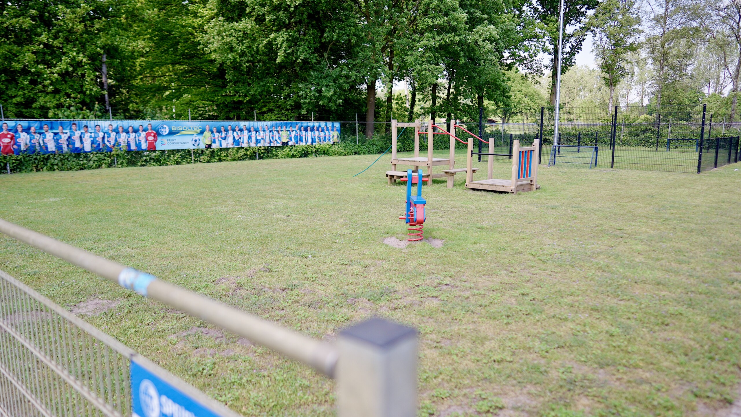 De buitenruimte van onze sportieve opvang biedt een groot voetbalveld en diverse speelmogelijkheden, waaronder een speeltuin en een pannaveld.